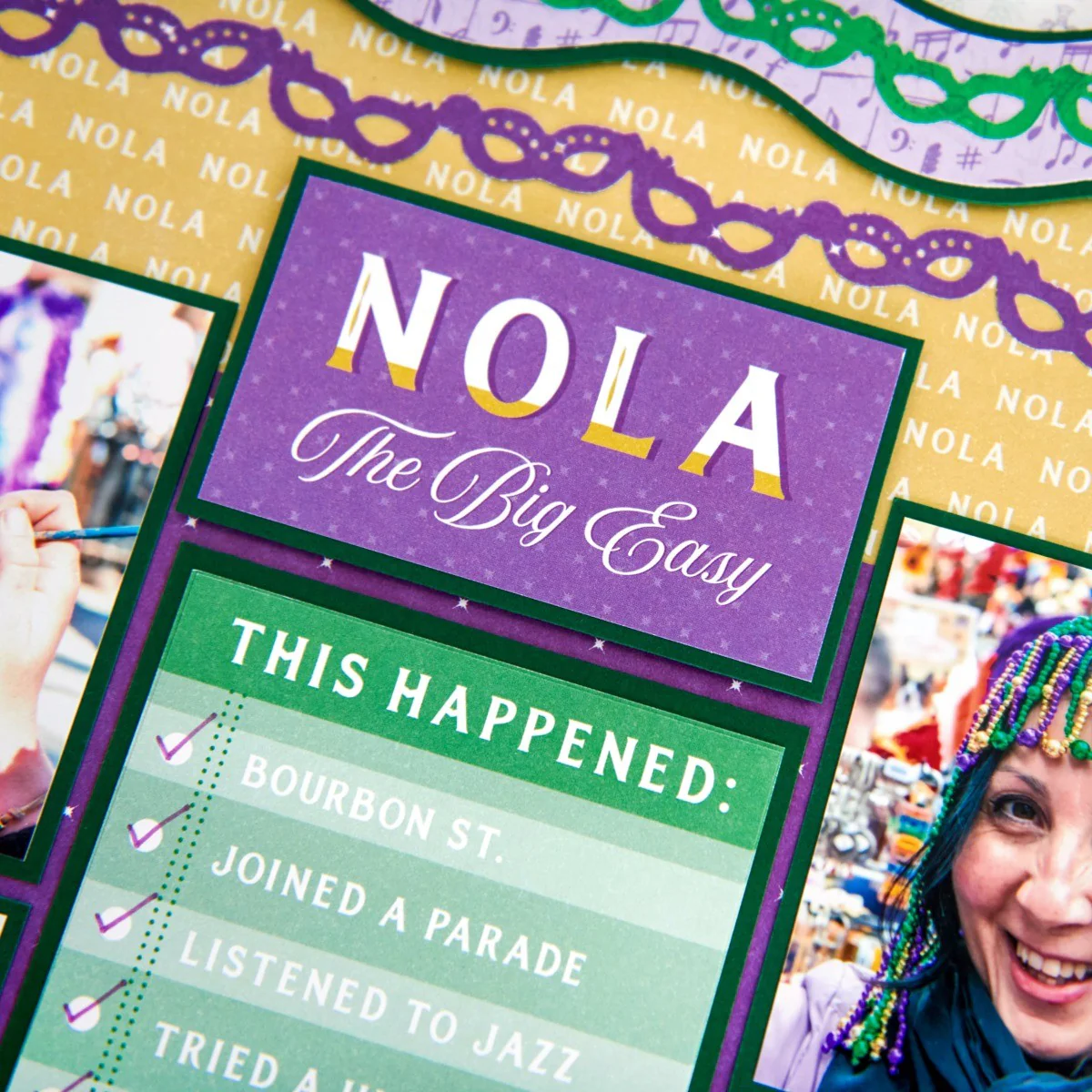 Create perfectly themed layouts for memories of time spent in New Orleans with the Let the Good Times Roll Paper Pack! This New Orleans themed scrapbook paper features NOLA-inspired designs in a bright palette of purple, green and gold, including patterns like jazzy notes and alligators, fleur de lis, repeating patterns of the state of Louisiana and a sheet with a variety of sayings that you can cut out to use as decorative mats or titles on pages. These papers are ideal for showcasing your New Orleans experiences like enjoying musical events, exploring on the bayou, celebrating Mardi Gras and enjoying beignets and Cajun cuisine.