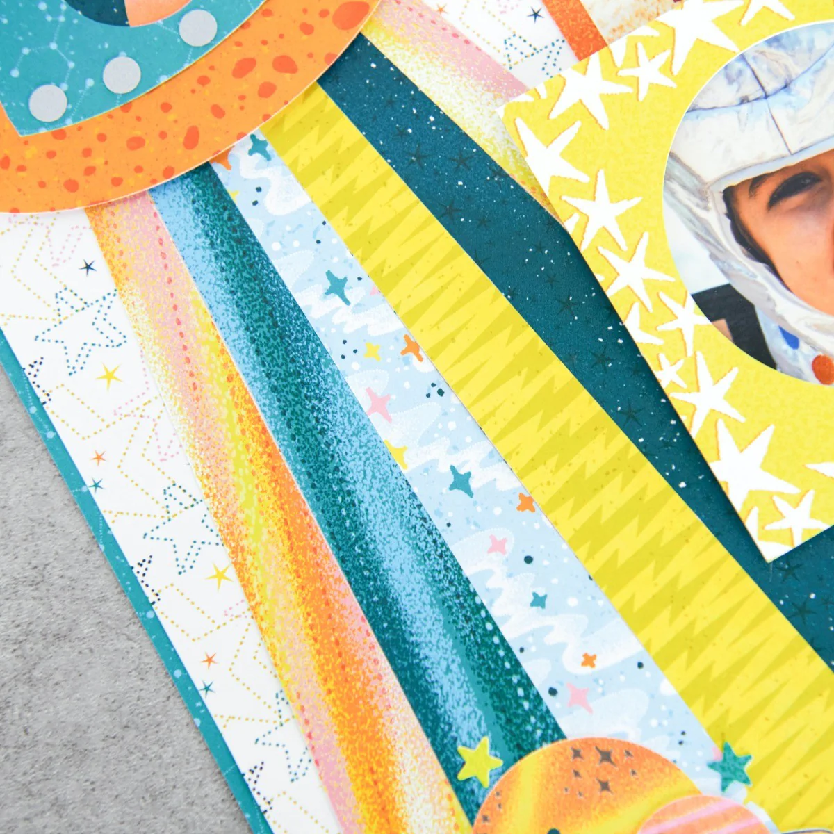 Plan-et your next layouts for the littles with the Outta This World Paper Pack! This outer space scrapbook paper pack was inspired by the wonder of space, from planets to stars and astronomical adventures, and it's cosmically cool with patterns of constellations, stardust stripes, iconic designs infused with rockets, planets and stars, cool and warm dotted textures, lightning and craters in a playful palette of sky and night sky blue, aquamarine green, lemon yellow, bright orange and cotton candy pink. Itās the ideal backdrop for showcasing kidsā photos like the first day of school, play dates, field trips and other special moments!