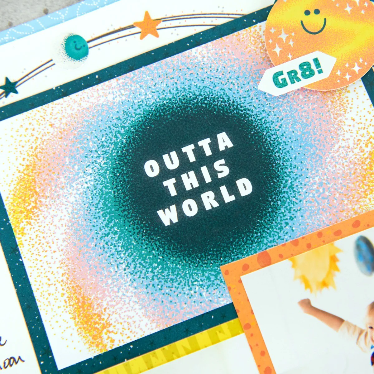 The stories of your little shining stars are calling â share the kiddosâ memories with the Outta This World Variety Mat Pack. These outer space photo mats are the perfect backdrop for matting 4x6 photos with their galactic designs infused with constellations, dotted textures and stars; to journal their stories inside of cosmically cool journal boxes shaped as rockets, moons, spaceships and aliens; and to use as decorative title mats with phrases like âThe stars are calling,â âOutta this worldâ and âBeyond infinity.â Includes 24 mats in two sizes (4x6 and 4.5x6.5).