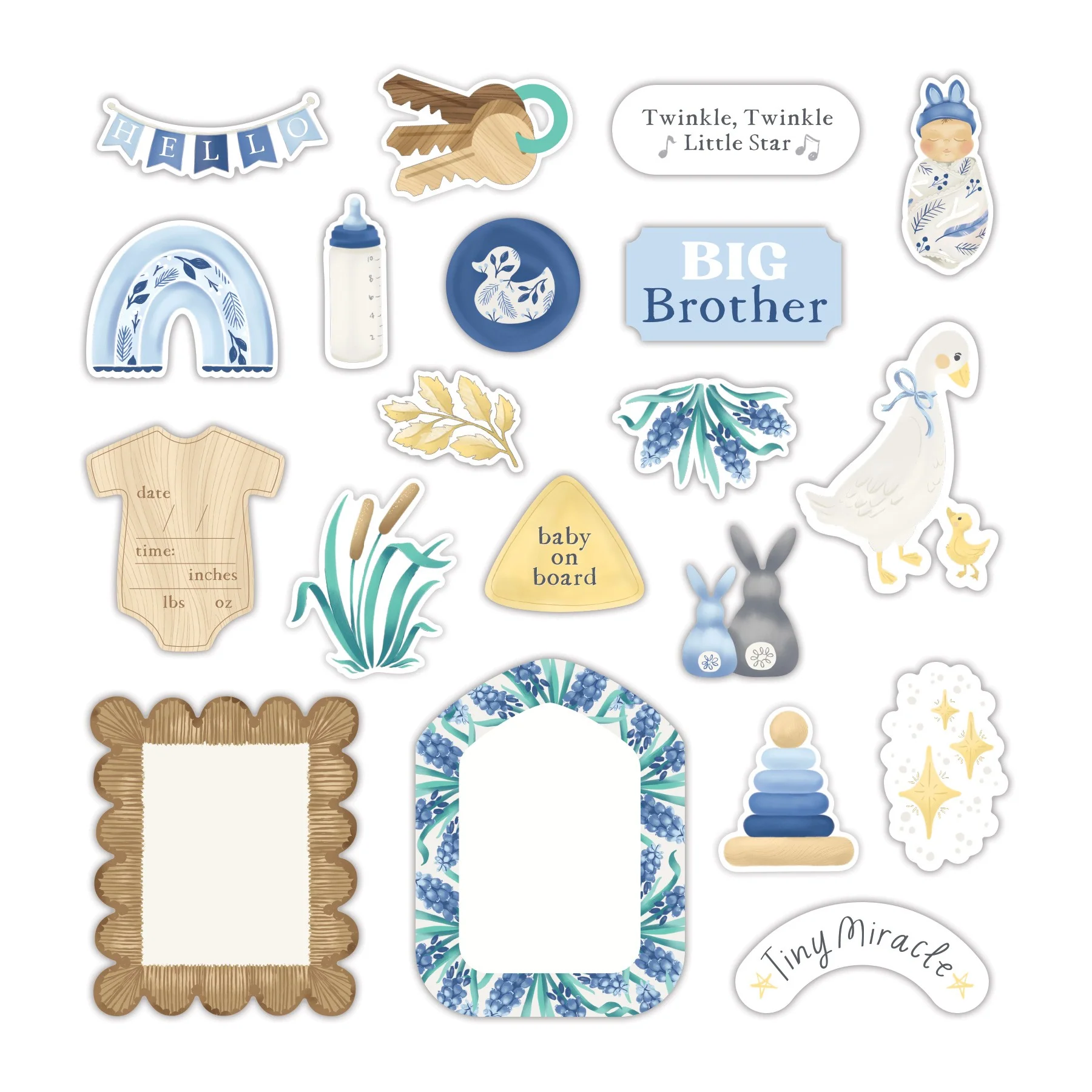 Keep moments with your mini-me perfectly accented with Welcome Baby Blue Embellishments! These baby girl or baby boy scrapbook embellishments add tender charm to your layouts with icons like wooden alphabet blocks, draped banners, scalloped frames, a swaddled baby, wooden onesie, beaded pacifier, wispy florals and geese making a splash. Create your own embellishments when you pair them with sayings like “Tiny miracle,” “Handsome like my daddy” and “Baby on board.” They’re ideal alongside photos of first bathtimes and birthdays, carpet crawling, highchair hijinks, walks in the stroller and tummy time.